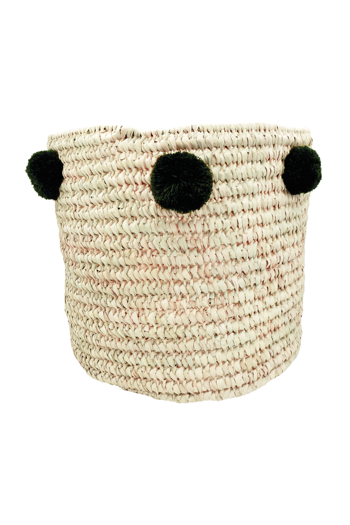 Der Aufbewahrungskorb ist in zwei Farben (Pompons- Olive oder Mustard) und zwei verschiedenen Größen erhältlich.