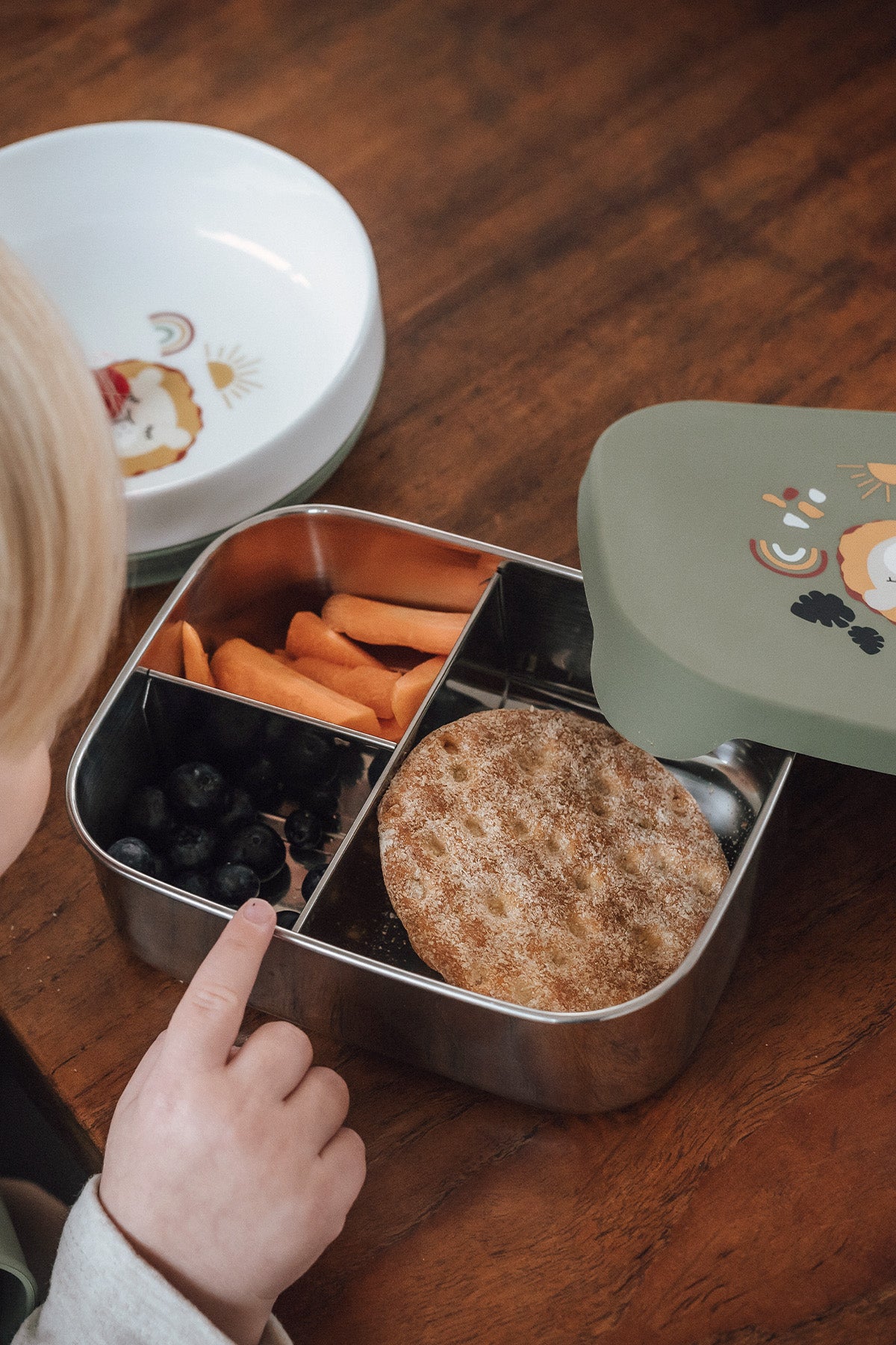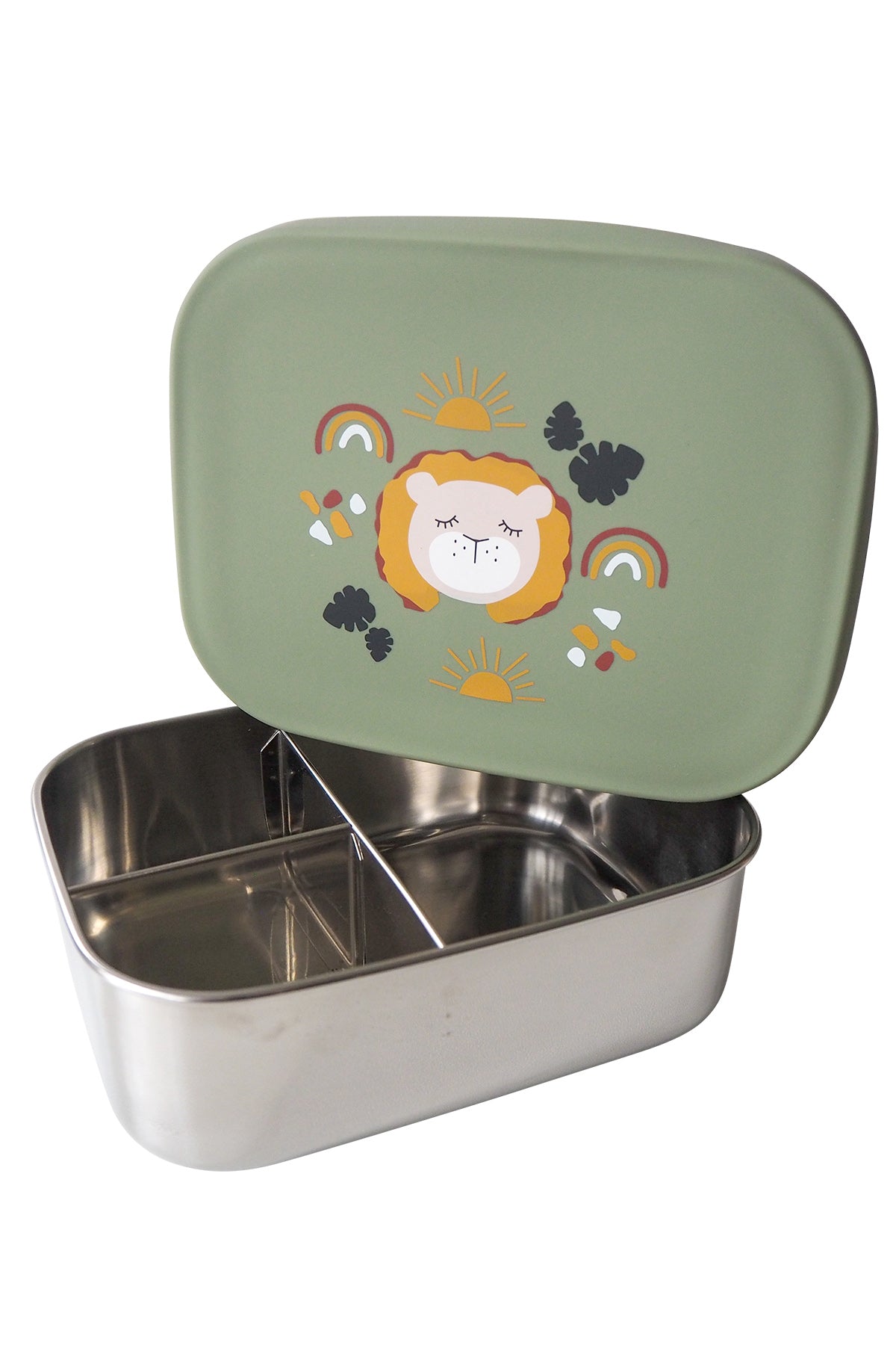 Kleine Snacks lassen sich in den niedlichen Brotdosen praktisch in Kindergarten, Schule oder zu Ausflügen mitnehmen. Sie sind aus rostfreiem Edelstahl mit einem liebevoll gestalteten BPA-freiem Silikondeckel. Im Inneren der Box befindet sich ein Trenner aus Edelstahl, der die Box in drei praktische Fächer unterteilt, so dass verschiedene Lebensmittel darin aufbewahrt werden können. Edelstahl nimmt weder die Farbe noch den Geruch des Lebensmittels an. Die Boxen sind stabil und leicht und der Silikondeckel verschließt die Dose luftdicht. Er ist kindgerecht mit niedlichen Designs ausgewählter kikadu-Tiergesichtern gestaltet. Spülmaschinen geeignet. Altersempfehlung: 3J. Maße: 17 x 13 x 5, 5 cm. Fassungsvermögen 900ml.