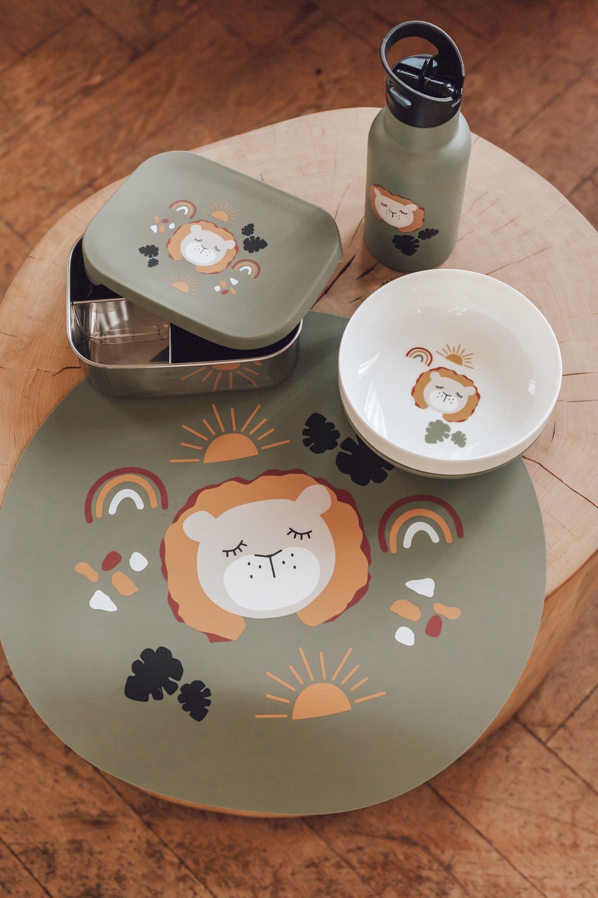 Die Brotdosen sind mit unterschiedlich gestalteten Silikondeckeln erhältlich. Jedes Design gibt es auch als Trinkflasche, Schale, Lätzchen und Platzset.