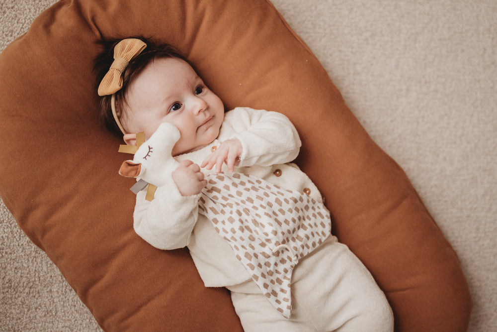 Das kleine Giraffen Schmusetuch ist im Vergleich zum großen Giraffen Schmusetuch etwas kompakter und handlicher. Es hat einen kleinen Giraffenkopf und ist mit einem einlagigen Schmusestoff ausgestattet. Der Spielfaktor aber ähnlich: Zum Spielen und zum Kuscheln und da dein Baby alles gerne mit dem Mund erforscht, auch zum dran knabbern. Es ist in zwei Farbvarianten verfügbar: Olive oder Giraffenmuster. Dieser Artikel ist GOTS- zertifiziert. Altersempfehlung: 0+ Maße: 30x18x3cm Pflege: Waschmaschine bei 30°