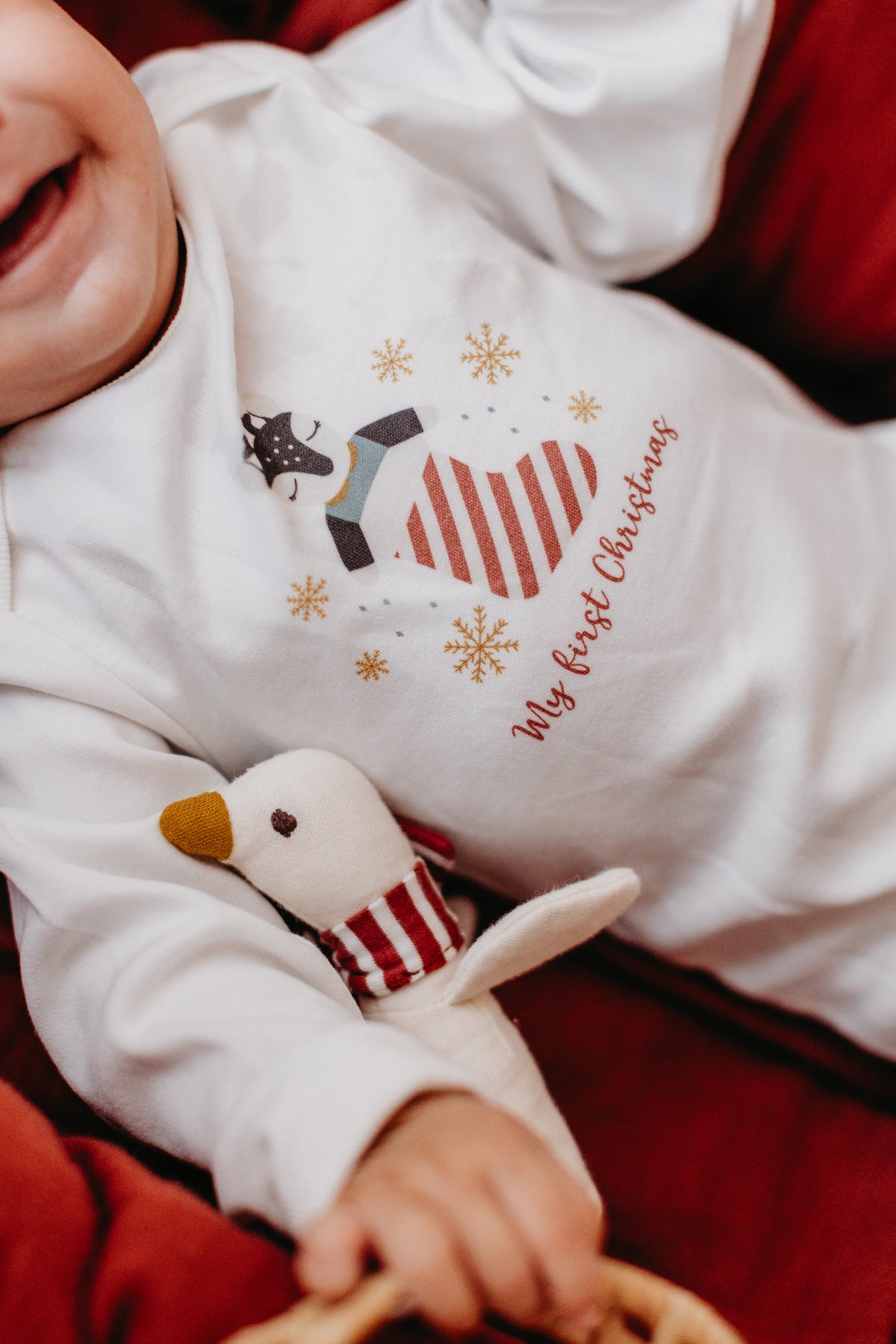 Dieser kleine Spielgefährte findet überall Platz und wird deinem Baby aufgrund seiner handlichen Größe nicht von der Seite weichen. Die niedliche kleine Gans eignet sich perfekt als erstes Spielzeug und ist auch ein schönes Geschenk zur Geburt. Durch die kleine Größe und das leichte Gewicht kann sie von Babyhändchen gut gegriffen werden. Im Inneren befindet sich eine Rassel, die sanfte Geräusche macht und das Hörvermögen deines Babys stimuliert. Hergestellt aus 100% Bio-Baumwolle, ist sie sanft zur zarten Babyhaut und umweltfreundlich. Dieser kleine Spielgefährte wird schnell zum Lieblingsspielzeug deines Babys und bringt Freude und Komfort in den Alltag.