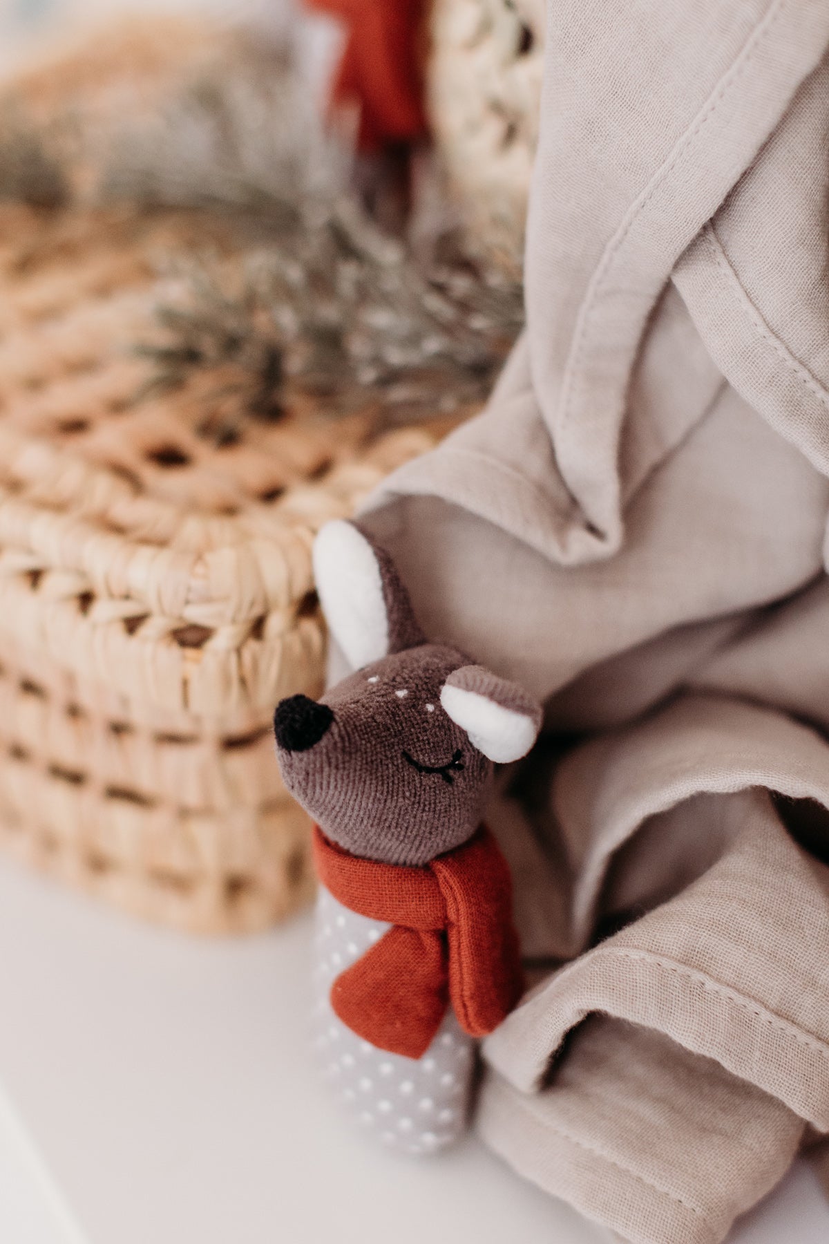 Dieser kleine Spielgefährte findet überall Platz und wird deinem Baby aufgrund seiner handlichen Größe nicht von der Seite weichen. Das niedliche kleine Rehkitz eignet sich perfekt als erstes Spielzeug und ist auch ein schönes Geschenk zur Geburt. Durch die kleine Größe und das leichte Gewicht kann sie von Babyhändchen gut gegriffen werden. Im Inneren befindet sich eine Rassel, die sanfte Geräusche macht und das Hörvermögen deines Babys stimuliert. Hergestellt aus 100% Bio-Baumwolle, ist sie sanft zur zarten Babyhaut und umweltfreundlich. Dieser kleine Spielgefährte wird schnell zum Lieblingsspielzeug deines Babys und bringt Freude und Komfort in den Alltag.