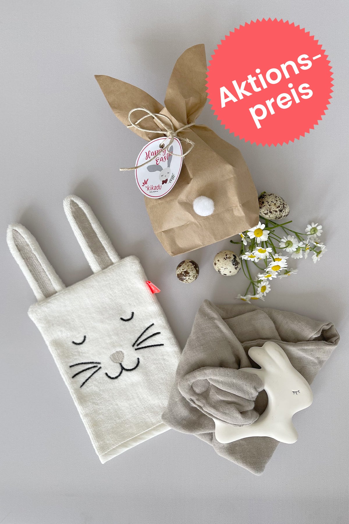 In diesem liebevoll verpackten Osterhäschen-Set befindet sich ein Waschlappen und ein Natur-Kautschuk Hasen-Beißring mit Schmusetuch von kikadu.