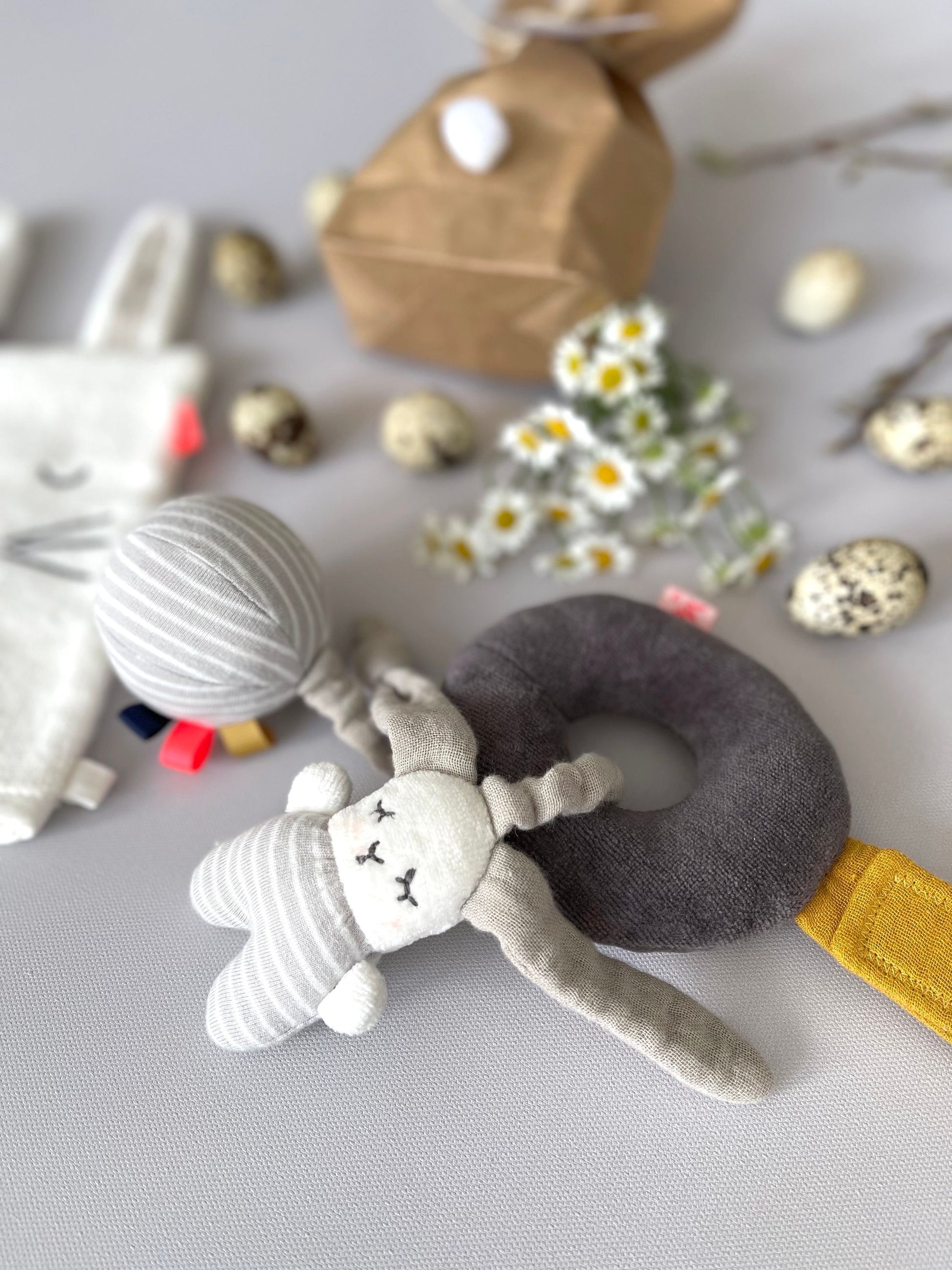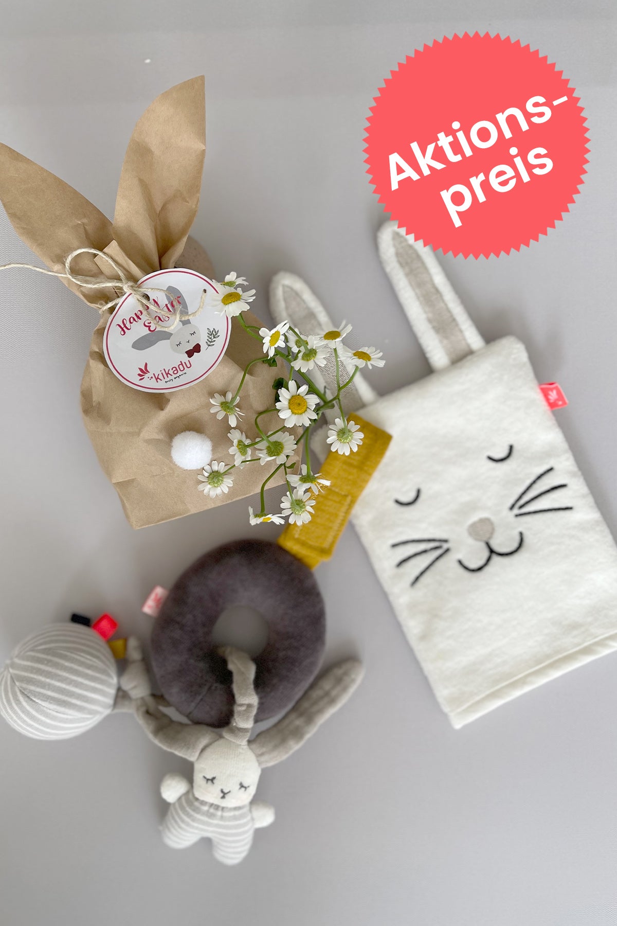 In diesem liebevoll verpackten Osterhäschen-Set befindet sich ein Waschlappen und ein Minimobile mit Rassel von kikadu.