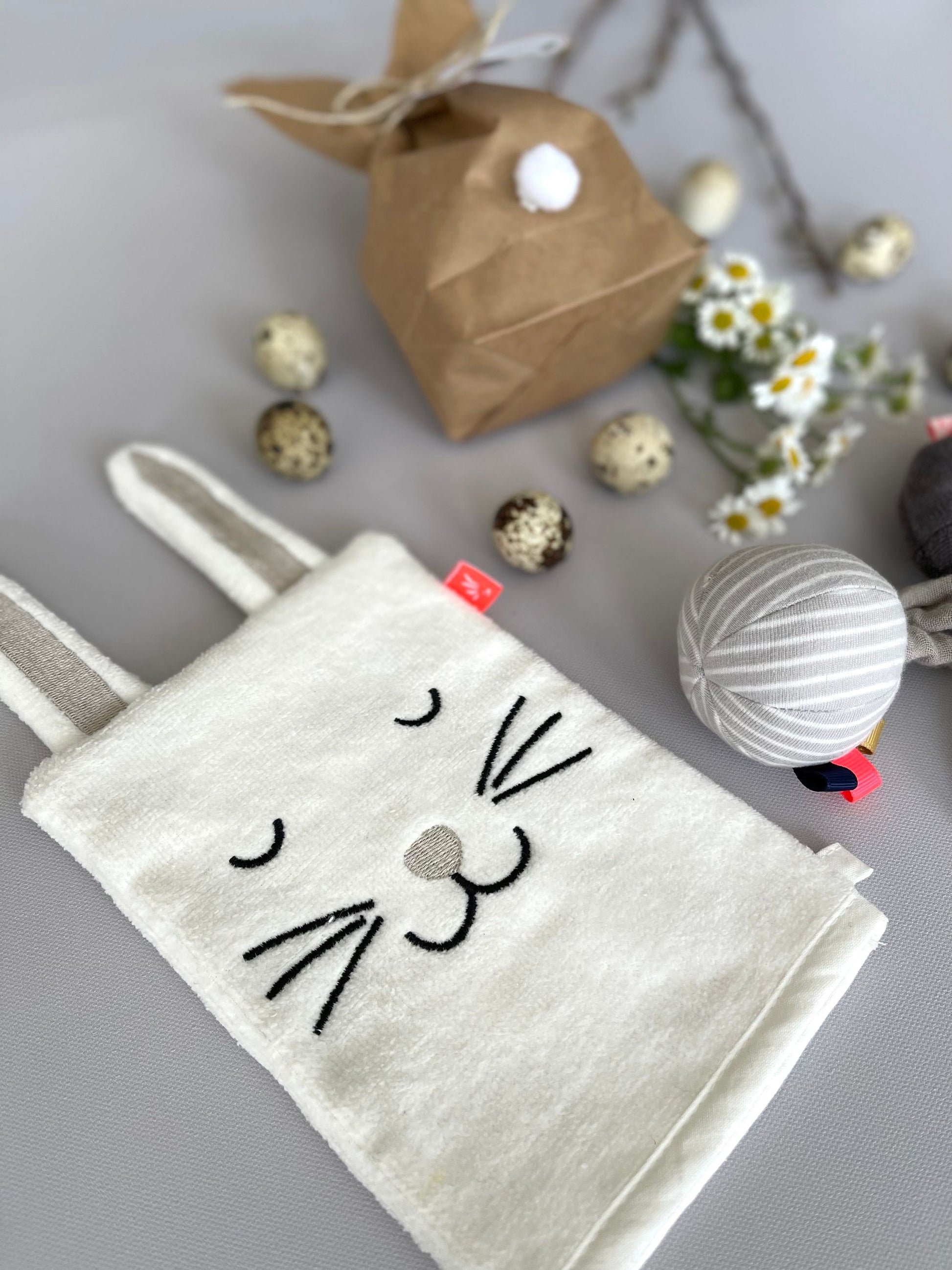 Wie macht Waschen richtig Spaß? Mit diesem hübschen Waschlappen im Hasen Design. Der kuschelig weiche, GOTS zertifizierte Waschlappen aus Bio Frottee hat ein aufgesticktes Hasengesicht? und bezaubernde Hasenöhrchen.