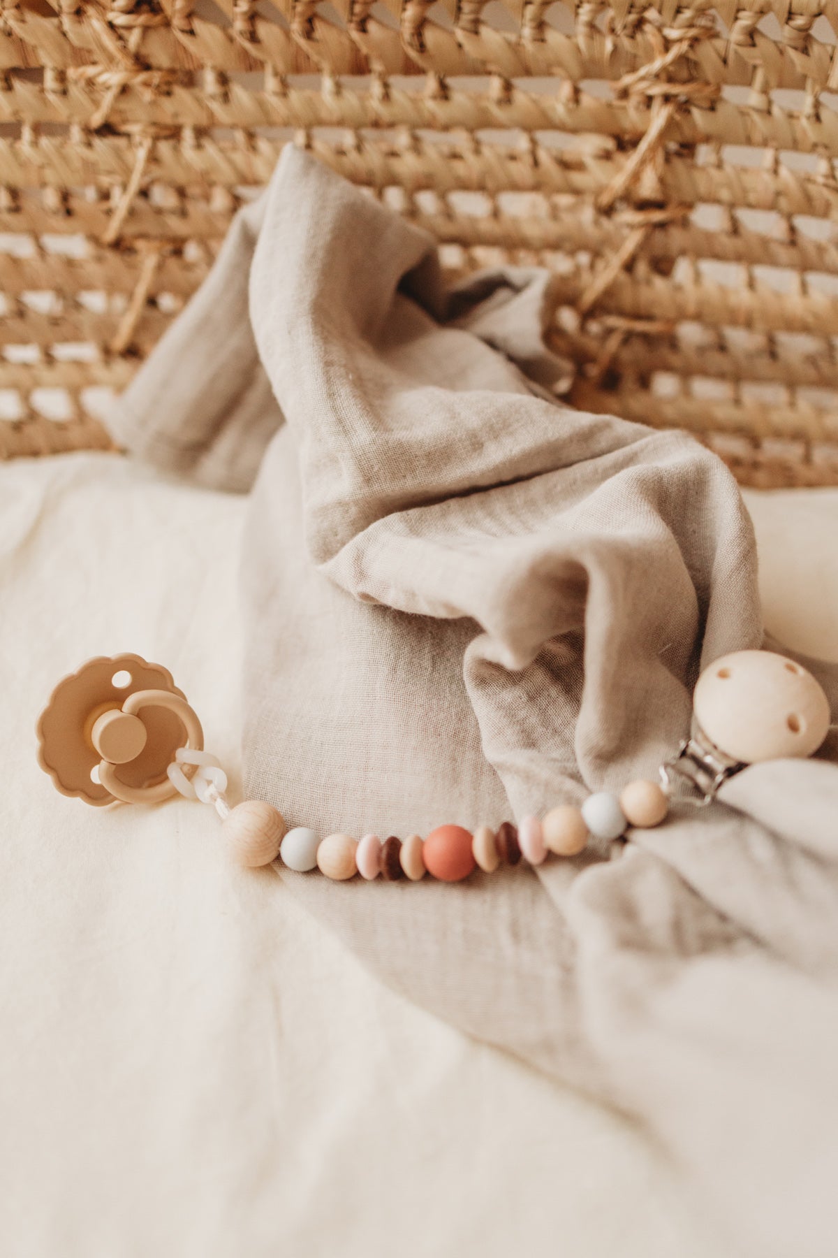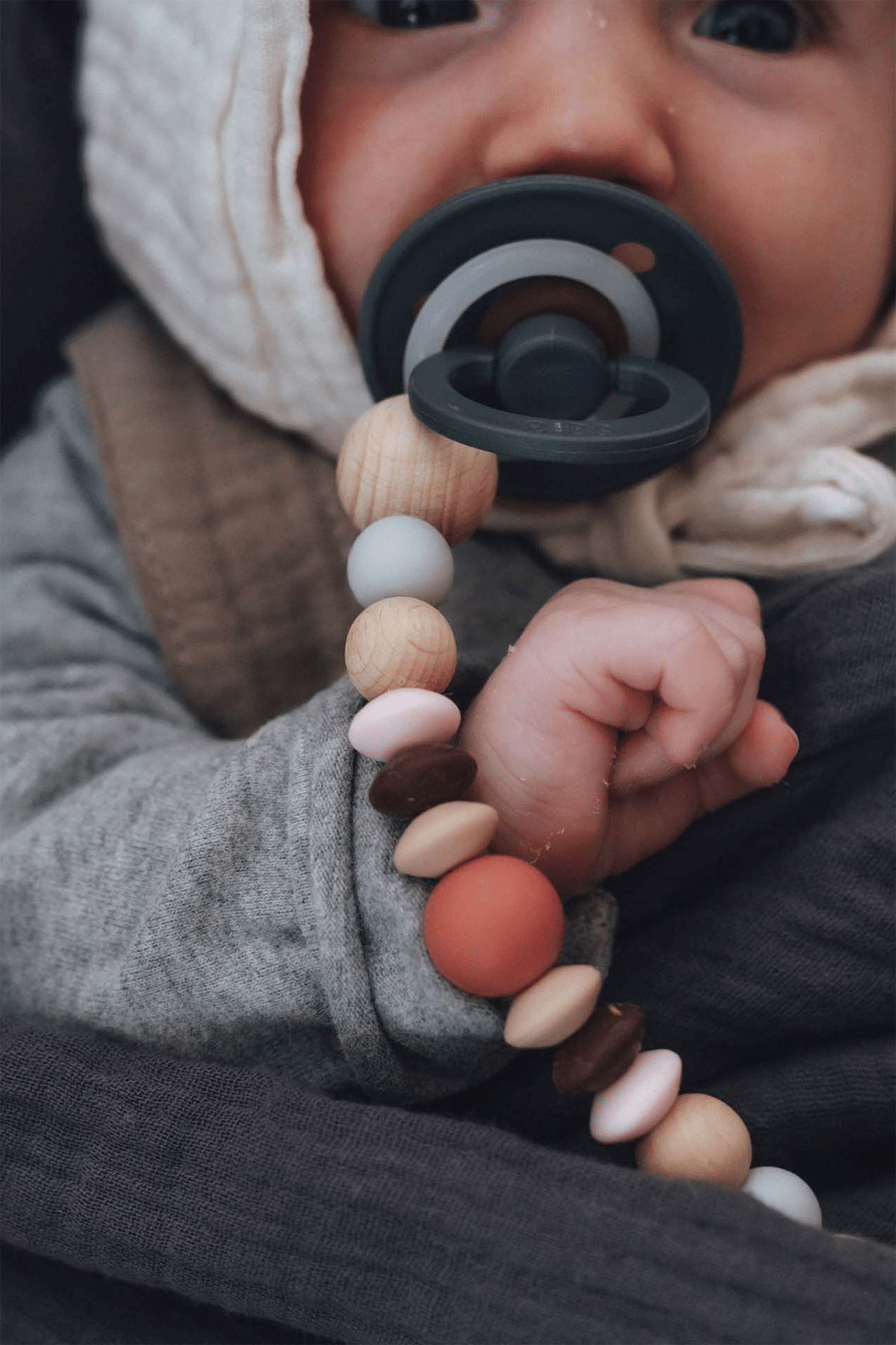 Entdecke die wunderschönen Schnullerketten von kikadu, die mit ihrem natürlichen Design bestechen. Hergestellt aus PEFC-zertifizierten Buchenholzperlen und bunten Silikonperlen in ansprechenden Farbkombinationen, sind sie nicht nur schön anzusehen, sondern auch sicher für dein Baby. Der Schnuller-Clip aus PEFC-zertifiziertem Ahornholz ermöglicht eine einfache Befestigung.