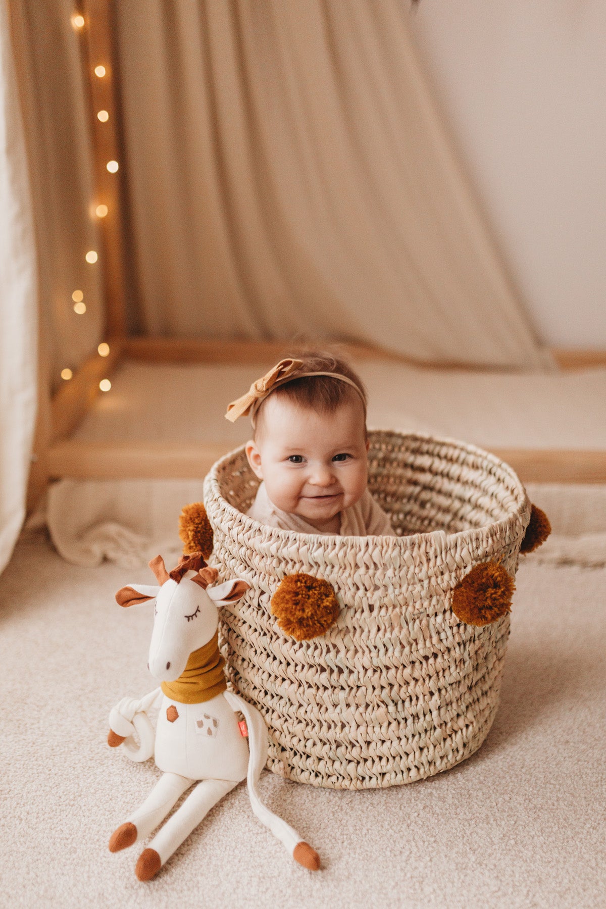 Mit diesem großen Aufbewahrungskorb von Kikadu verwandeln Sie Ihr Zuhause in eine Wohlfühloase. Der Korb ist, dank seines schlichten Designs vielseitig einsetzbar und mit fast allen Einrichtungsstilen zu kombinieren. Hergestellt aus Palmblättern, ist dieser Korb nicht nur im Kinderzimmer ein echter Hingucker. Der Aufbewahrungskorb ist in zwei Farben (Pompons- Olive oder Mustard) und zwei verschiedenen Größen erhältlich. Modell. 9917601 Maße: 30 x 30 x 30 cm Material: 100% Biobaumwolle Pflege: mit einem feuchten Tuch reinigen